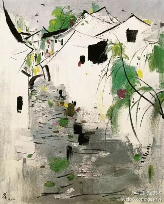 吴老的很多作品都以江南水乡为题材,画面充满诗意,他特别重视点、线、面的结合与搭配,在画面的点滴中流露出他浓浓的乡情与对形式美的追求。
