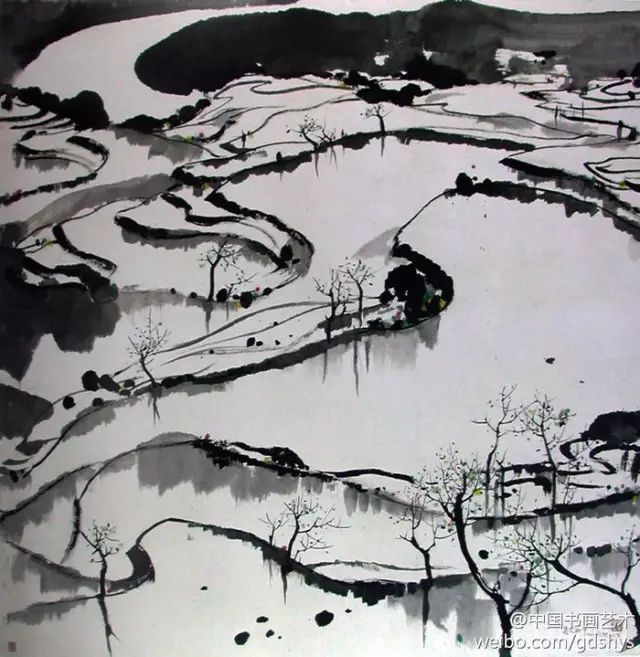 七十年代后期,吴冠中将此题材移入水墨创作,他自谓“扬弃水光天色之色彩变化,既避免了油色之滞凝,更着力于发挥线之盘旋与疏密,当可创造另一番境界与腔调,这便是我经常将油画水田移枝进水墨的初衷。”本幅构图尤其大胆,整体空间协调均衡,墨色重沉,极见画家用心之巧妙。