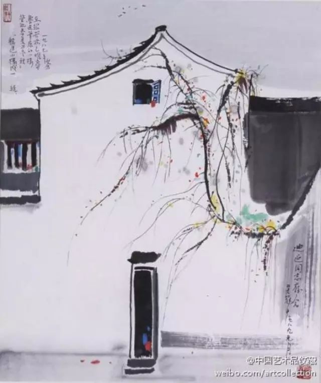 该画为展现江南白墙黛瓦的题材,因左上角的题诗而别有一番韵味。“躲进小楼成一统,管他春夏与秋冬”。吴冠中借喻了鲁迅笔下的“小楼”,表述自己躲进艺术殿堂,走南闯北,上下求索的情怀。