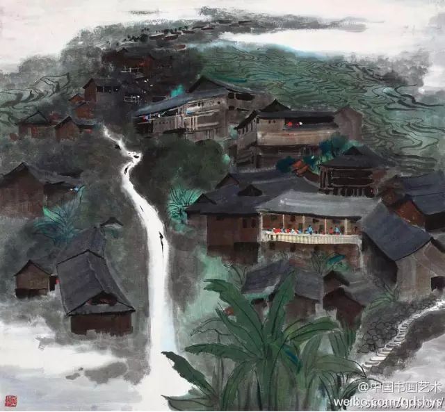 作于70年代,明显有偏繁、偏浓、偏具象的笔法特点,描绘的是云南乡村景象,以浓墨赭石描绘连绵不断的房屋,以绿色描绘成片的田野,整幅画面以暗淡的色彩为主调,然画家又在中间绘一条白色的溪流,提亮了画面的色彩,与画面边角的留白遥相呼应,使整个画面充满了灵动感。