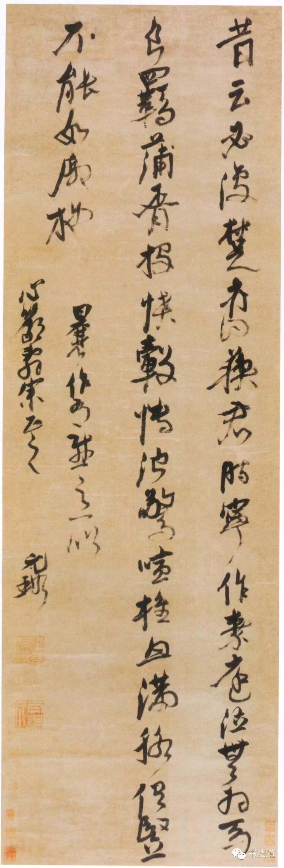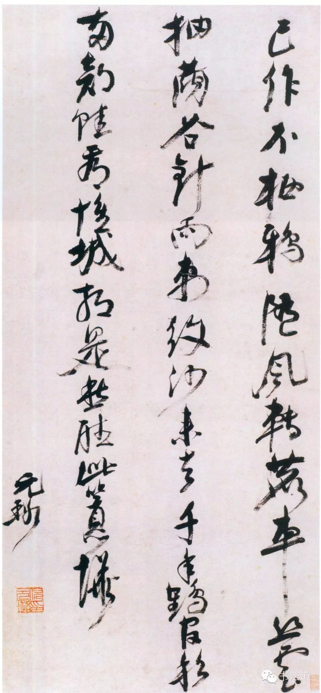 此幅书作行间宽疏,笔力挺拔,墨色厚重,显出绝妙的润燥对比。其笔线顿挫中益见苍劲含蓄,骨力超迈,如“风”字的撇画、“车”字的中竖、“纹”字的撇捺、“城”字的戈钩、“是”字的捺笔等。这是黄道周、王铎的作品中所不曾有的,显示了倪氏不与人同的高雅风骨。整体章法疏密有致,生动灵变,显得书卷气十足。仿佛长空雁阵,赛道群马,在飞腾奔突之中,韵律井然;在宽广的天地间,留下了稍纵即逝的富有生气的诗的规迹。从结字用笔看,无疑是他的神品。