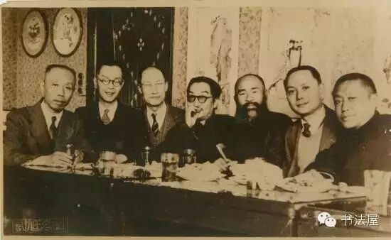 1946年12月,吴湖帆与友人摄于黄山艺苑,右起:郑午昌、张充仁、张大千、吴湖帆、许士骐、汪亚尘、颜文樑