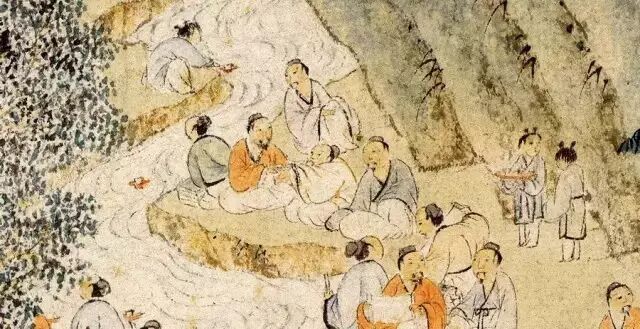 这天,王羲之邀请谢安等42名流,在会稽山阴的兰亭集会,举行禊礼,饮酒赋诗。玩“曲水流觞”(见上图),怎么玩呢?把酒杯放到水里自由漂流,酒杯停在谁面前就得作诗,作不出来就喝酒。看看人家东晋名流,把高雅玩的。今天,我们只剩划拳拼酒。