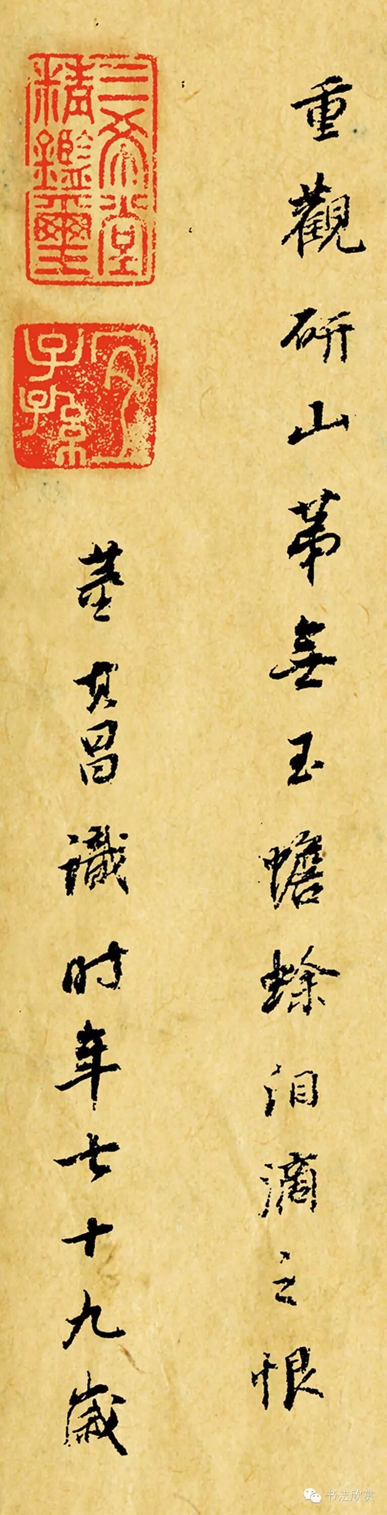 崇祯七年(1634)。岁在癸酉(1633)子月。申甫计偕入都门。再观于东华门邸中。一似米老重观研山。第无玉蟾蜍泪滴之恨。董其昌识。时年七十九岁。
