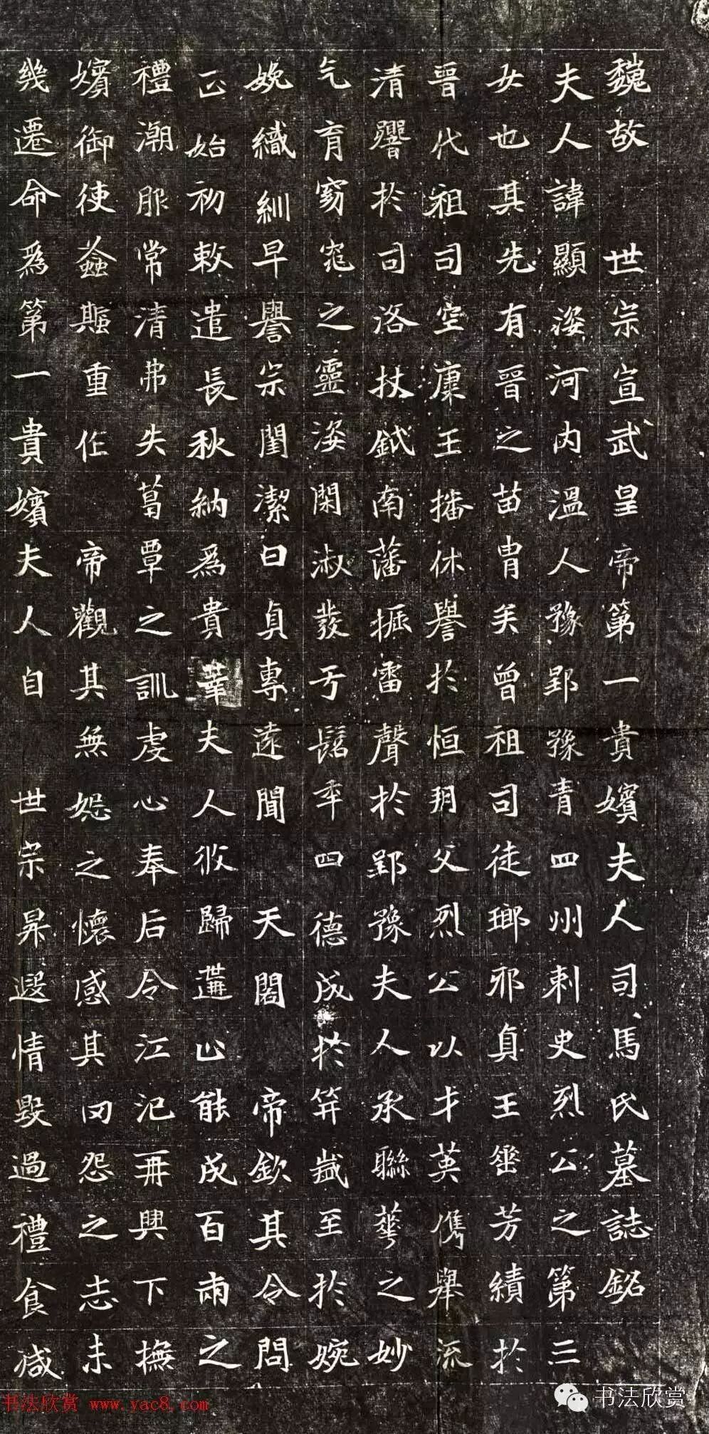 北魏正书《司马显姿墓志》全图,全称《魏故世宗宣武皇帝第一贵嫔夫人司马氏墓志铭》。此志书刻皆精,为其时墓志铭中的上品,梁启超评为“于俊拔之中,别饶韶秀”,也是初学楷书的佳品。