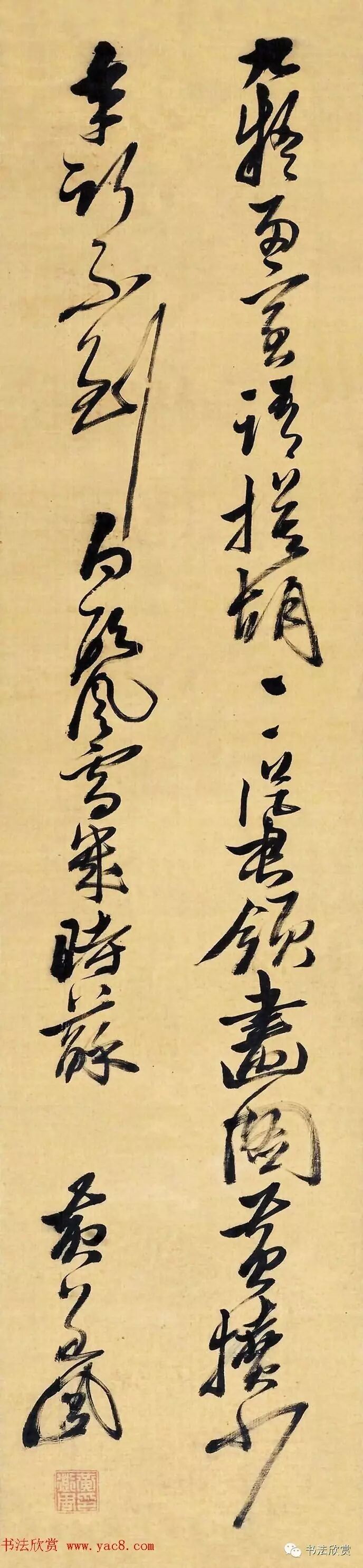 黄道周与张瑞图一样,立志颠覆传统审美趣味,革新晚明书坛软媚薄弱之风。张扬个性,不拘成法。其书遒劲雄畅,气力外拓,不像张瑞图那样将力与形都抱紧成一团,似乎随时都准备抵御着外力。黄道周书风显然开朗宽博得多,就象他的为官处事一样,永远直面异端、直面人生。他行楷多而草书少,此轴行而兼草,飞扬腾沓,意兴激昂,是其佳作。