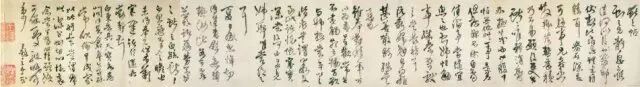 王铎《草书临阁帖卷》,书于明崇祯十六年癸未(1643),时五十一岁,值明亡前一年,属较晚时期作品,个人风格基本形成,正处在人生遭际突变、心态大乱的前夕。王铎在书写此帖时,似并未十分顾及原帖的字形,也不在意文章句读,只是不停地凭感觉一任笔墨驰骋地书写下去,用自己的笔法改变二王的笔势,将其本不连接的草书结体缠绕相续,形成一组一组的疏密空间,并以具有屈铁般刚健之气的线条取代圆转挥运连绵不断的笔势,演绎翻腾跳跃的势态,随机应变,神出鬼没,构成其人独特的艺术境地,与原帖异其情趣。通卷书法点画雄实,大小不一,字距参差,古朴劲美。飞腾跳掷,纵横捭阖,大气磅礴,功夫淳深。其以雄强霸悍的笔力、奇诡怪伟的体势、酣畅淋漓的墨彩,表达了大起大落、汹涌激荡的情绪和心境。