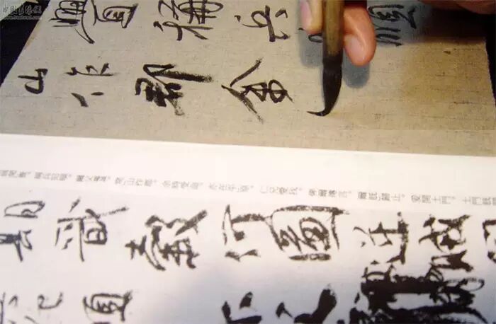 书写的时候,要有意识把笔杆倾斜一定的角度,这个角度随运笔不断变化方向。但可不是象流行书风那样横过笔来刷字啊!这个笔杆的倾侧角度,主要由手腕的内挑和外翻形成,切莫用手指和肩臂运作。