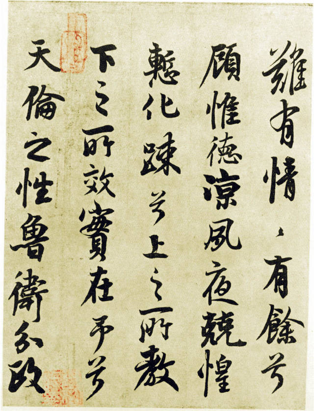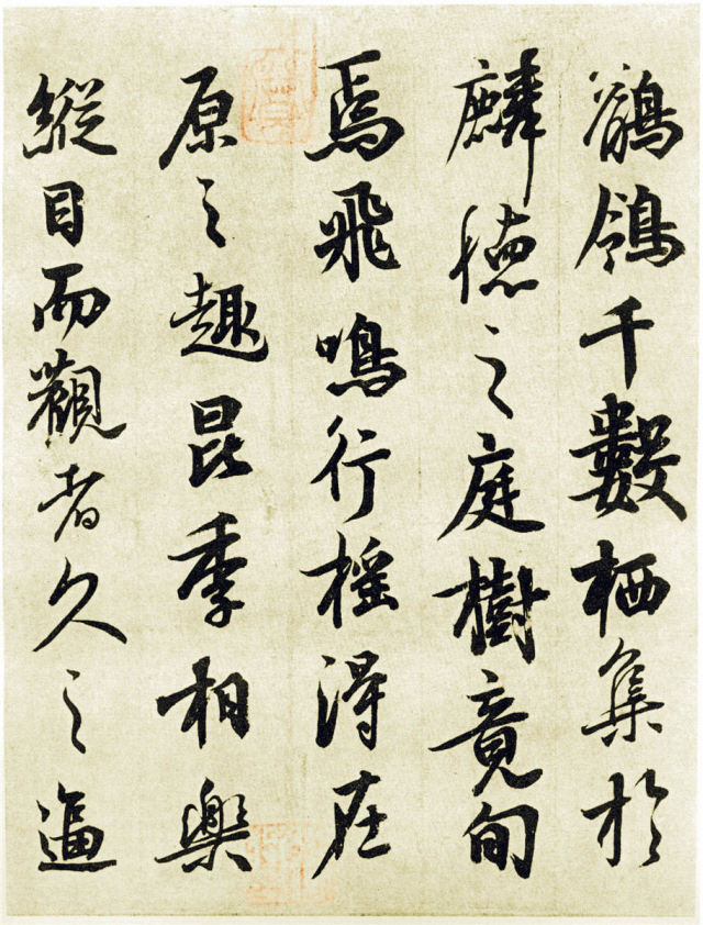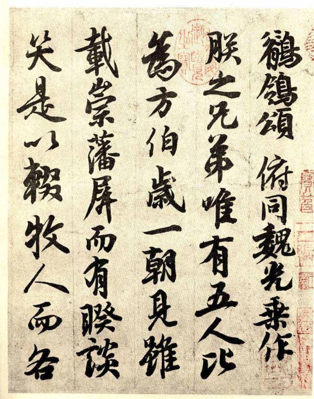 《鹡鸰颂》,疑双钩本,或出自宫廷书手。纸本。纵26厘米,横192厘米。行书,40行,计337字。钤有“宣和”、“政和”、“内府图书之印”、“部曲将印”、“晋府图书”、“吴廷”、“石渠宝笈、“嘉庆”、“宣统御览之宝”等鉴藏印。曾经宋宣和内府、明晋王府、吴廷、清内府等收藏,后有蔡京、蔡卞以及清人王文治等人跋。现在台北故宫博物院收藏。