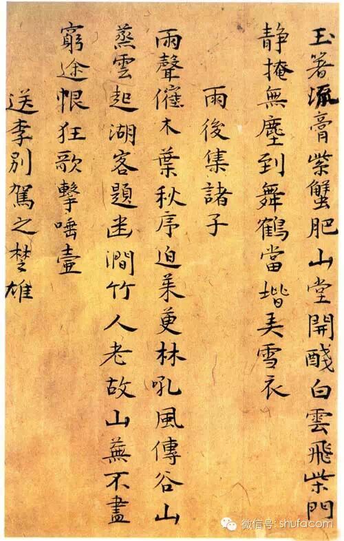 写小字的重心与笔画的配合,则与大字无大差异。至于运笔,则略有不同。小字运笔要圆润、娟秀、挺拔、整齐;大字要雄壮、厚重。大字下笔时用逆锋(藏锋),收笔时用回锋; 小字下笔时则不必用逆锋,宜用尖锋,收笔时宜用顿笔或提笔。譬如写一横,起笔处或尖而收笔处则圆; 写一竖,起笔或略顿,收笔则尖;撇笔则起笔或肥而收笔瘦:捺笔则起笔或瘦而收笔肥,同时也要向左向右略作弧形,笔画生动而有情致;点欲尖而圆,挑欲尖而锐,弯欲内方而外圆,钩半曲半直。运笔灵活多变,莫可限定。尤其是整篇字,要笔笔不同,而又协调一致,一行字写出来,错落有致,却又一直在一条线上,如是则行气自然贯串,望之如串串珍珠项链,神采飞扬。