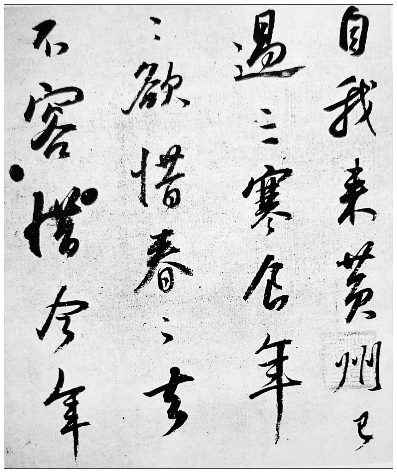 此作为宋元丰五年亦即公元一○八二年苏轼被贬黄州时写下的两首诗稿,纸本,原件现藏台北故宫。是年三月清明时节,苏轼自黄州至沙湖,再游蕲水,作了一次短暂的春游,无非是身遭磨难苦中作乐而已。在如此困顿无助的日子里,还保持着文人的童心雅趣,对生命充满着赤诚热爱,这是苏轼性格中的可爱之处。正因为如此,也才有了这件诗书双璧的《寒食诗帖》。这是两首诗,自“自我来黄州”至“病起须已白”为第一首,“春江欲入户”至“死灰吹不起”为第二首。作者在诗中描述了自汴京被贬黄州三年来悲苦惨凄的生活境况,抒发了其欲哭无泪徒叹奈何的感伤情怀。因此,我们不能把这件作品简单地看作一件墨迹,一幅“好字”。在我们动笔临写之前,要认真地品读诗句内容,仔细体味作者的情感与心境,感受作者彼时彼地濡墨挥毫时的生命律动。品读体味既久,我们便会在不知不觉中慢慢地拉近了与作者的距离,直觉得作者就是我们身边的一位慈祥长者,向我们诉说着命运的不幸与激愤,满篇的点画线条也就与我们产生了一种亲近感,在我们眼前“活”起来了。