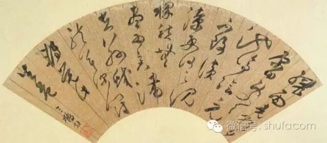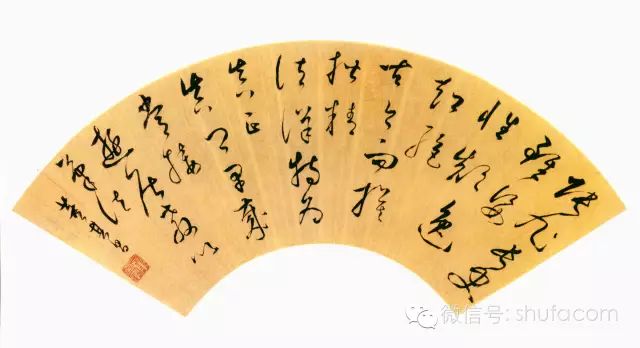 二、注重形式统一扇面书法的创作应当注重书体与形式的和谐统一,如篆、隶书多厚重古朴,大草多昂扬畅达,此三种书体字径稍大更能表现字体自身特性和书写者的创作水平。小楷、小草和小字行书,如果要写成较大的扇面,章法上要随形就势、灵活多变。