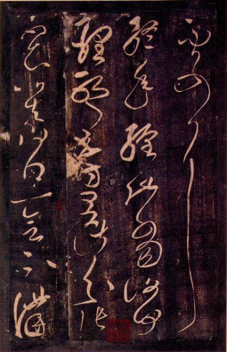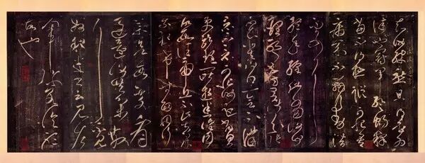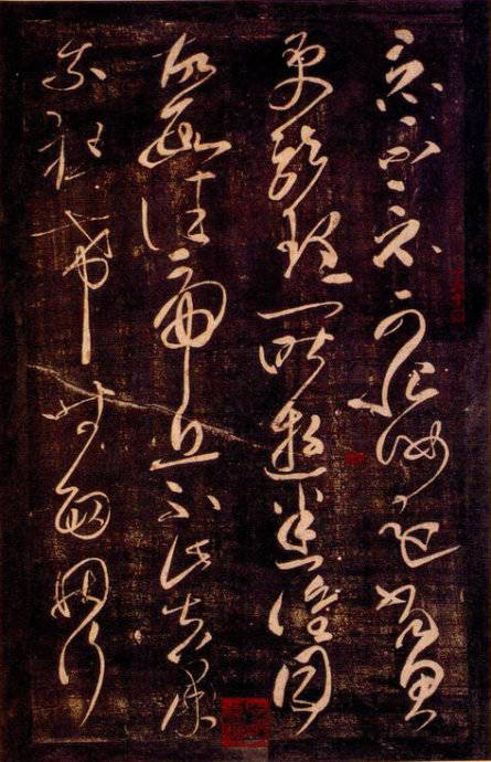 张芝《冠军帖》 此作用笔淋漓酣畅,使转法度严谨,表现了书家良好的控笔能力。点画起止分明,收放有度。点画处的“实”与牵丝的“虚”相得益彰。字势奇崛,振人心神。结字时有巧思,如“散”之险绝、“见”之内敛,“粗”字“米”旁的右上一点置入“且”的左上角等,都令人叫绝。