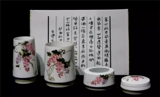 建国瓷厂 天青釉堆花 紫藤燕子 印泥盒