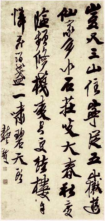 龚贤:字半千、半亩、清凉山人等,祖籍江苏昆山,流寓金陵(南京),为清初著名山水画家,“金陵八家之首。他隐居在清凉山半亩园“栽花种竹,足不履市井”,每天早晨,他看见树叶上的露珠,湿润的树林和中午的树林不同。江南烟雨,六朝的气息,梦幻一样美丽的山峦,长江沿岸的浅滩疏林、孤帆远影,都成了他追求的美好的象征。龚贤的山水画,特淡远苍秀,如不食烟火人长啸千仞之冈,濯足于万里之流;山林氤氲,草林华滋,气韵生动。书法为画名所掩,作品多兴致所至,用笔变化丰富,气势夺人。