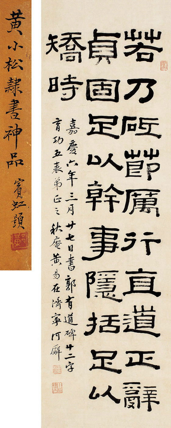 黄易:字大易,号小松,又号秋庵,仁和(今杭州)人。树谷子,监生,官济宁同知。尝有声幕府,以诗筒画笔,与簿书迭进,不废风雅。工书,娴熟隶法。隶书摹《校官碑额》,小隶有似《武梁祠题字》。精于博古,喜集金石文字,广搜碑刻,绘有《访碑图》,并著《小蓬莱阁金石文字》等。故隶法中参以钟鼎,愈见古雅。抚印为丁敬高弟,有出蓝之誉,与丁敬并称“丁黄”,为“西泠八家”之一。山水法董、巨,冷逸幽隽,以澹墨简笔写取神韵,而有金石味。兼工花卉,宗恽寿平。官济宁时,一花片叶皆能于质库易钱。间作墨梅亦饶逸致。