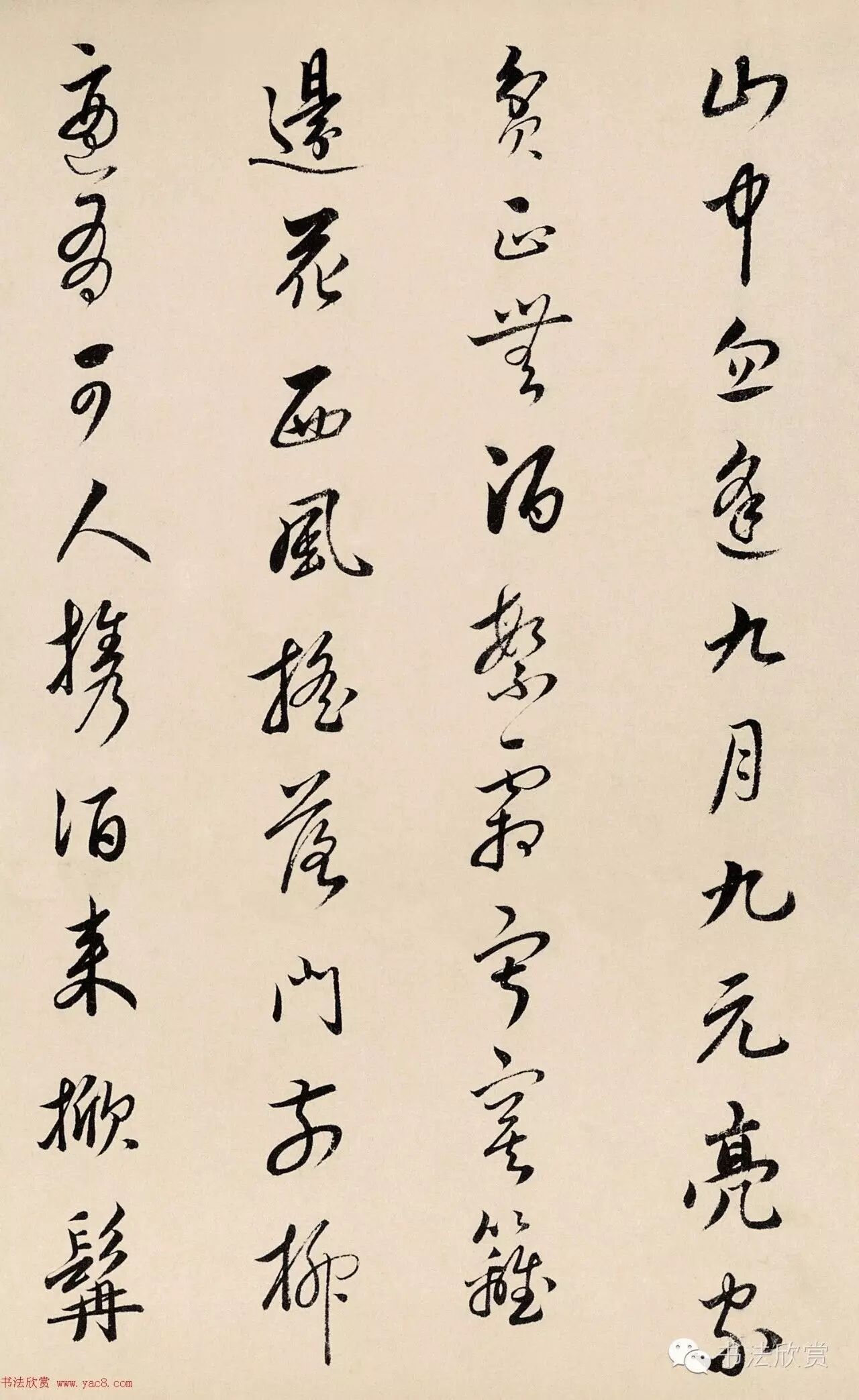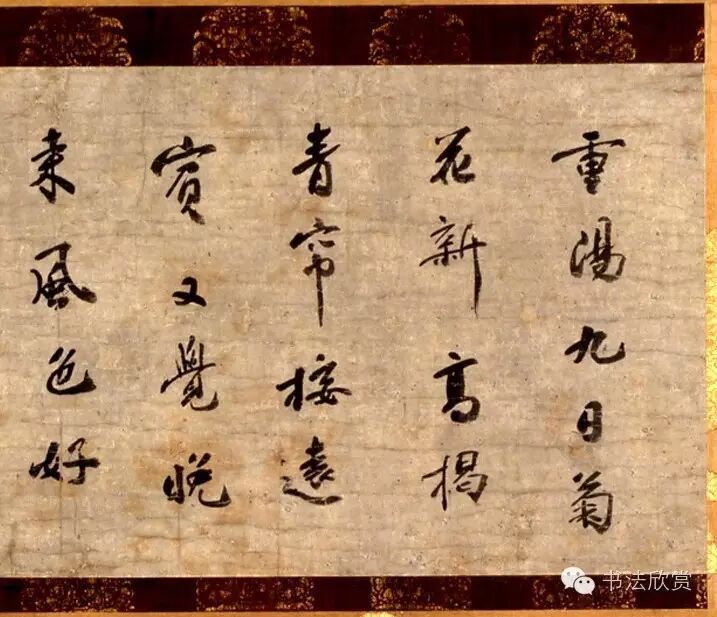 释文:重陽九日菊花新,高揭青帘接远宾。又觉晚来风色好,不知落帽是何人。