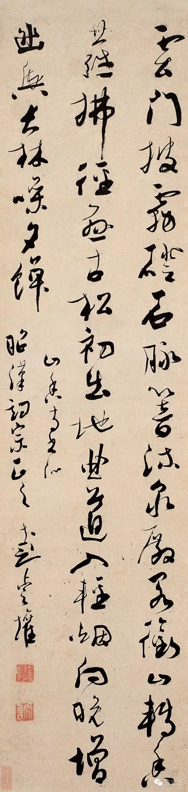 现以行草《刘长卿诗》轴为例,可看出其书风之一斑。该书为纸本,纵157.8厘米、横41.8厘米,书文乃录唐代刘长卿诗歌,末署“右刘长卿《答秦山人》、《住碧涧喜皇甫相访》、《钱起题精舍寺》、《晚入宣城界》,共诗四首,似□□词道兄正书,时康熙癸酉阳月,竹本彭睿壦”,钤白文方印“彭睿壦印章”、“闻自氏”和朱文方印“龙江村獠”。该书老笔纵横,盘桓曲折,而笔意萧疏,逸态横生,代表了彭睿壦的典型书风。其他如广东省博物馆所藏《草书轴》也与此类。