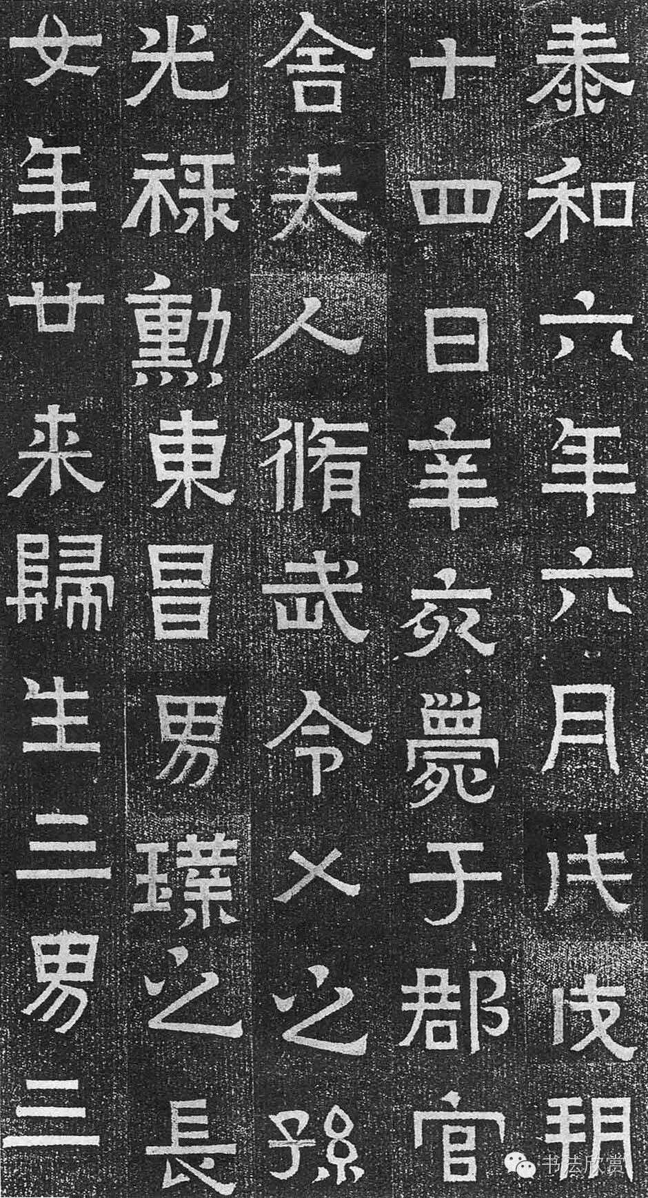 隶楷碑书欣赏:东晋王建之妻刘媚子砖质墓志,太和六年(371)。1998年,南京市北郊的象山出土。该碑书体介于隶楷之间,横画虽有波挑,但波挑收敛,体势明显具有一定楷书的特点。其中有的字隶意浓厚,与汉隶十分相近。又有个别字具有明显仿古的篆书遗意,极富有装饰性,实属罕见。