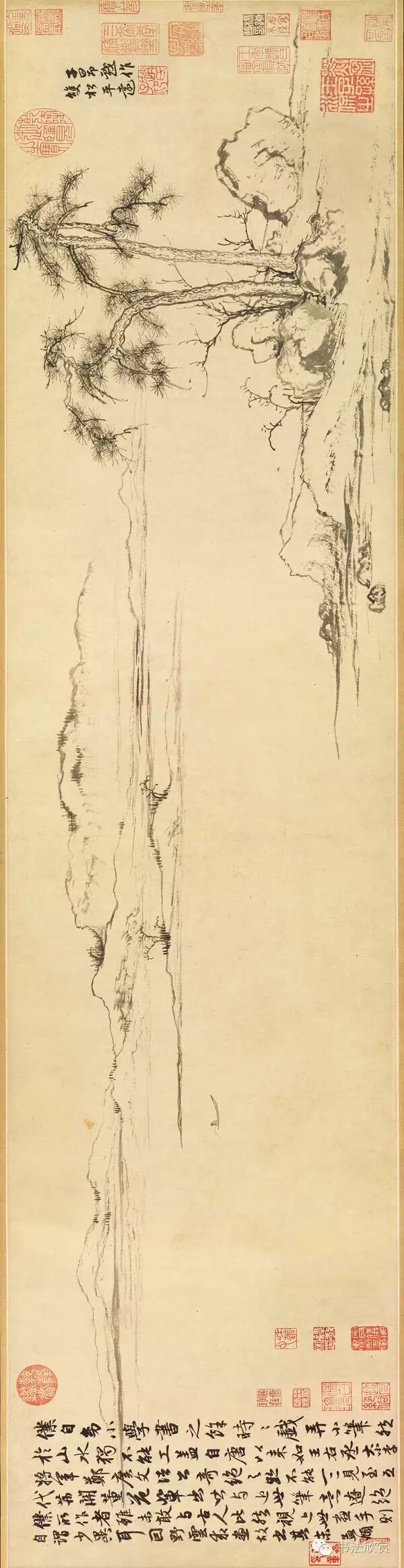 图中近景绘乔松二株及枯木坡石,隔水为起伏的山丘,画境简洁清旷,淡雅空灵。双松的画法稍工,山石则以带有飞白松动笔触勾括,略皴而无染。虽略存李郭画风之形,但简括异常,实属新体。画法上更具书法笔趣和文人墨戏的意味。