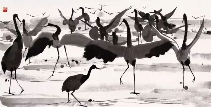 一群鹤在走,跃,舞,翔……题名《鹤舞》,作者之意在舞不在鹤,借鹤挥舞。这舞,亦无舞台起舞之规范,只是墨之舞,块面点线之共舞,鹤成了道具,或幌子。有心的观众当会联系到我画过的老虎高原,我在老虎与高原间尝试过往返追捕。
