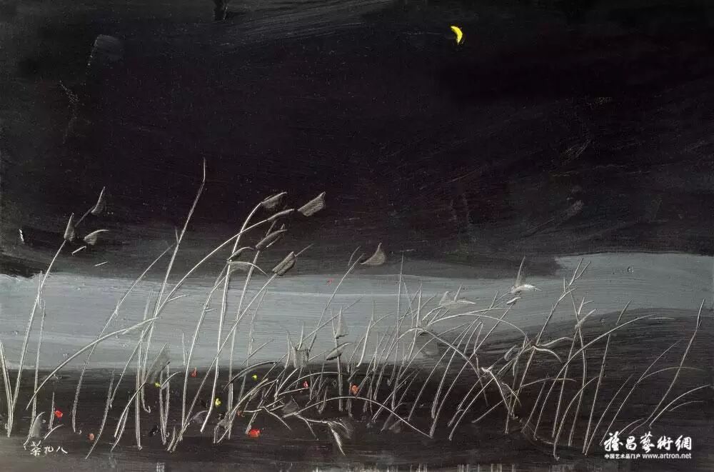 “无言独上西楼,月如钩”,在乌黑无边的夜空中,李煜所见之月,如钩,尖锐的钩,勾人心魂。我用刀尖刮出芦苇,虽疏疏落落,亦锋利尖锐而刺心。“恰似一江春水向东流”,江面的深灰色调和了夜的颜色。我无意为李煜词作插图,而窥见了词意与画境的交融处。如李煜见画,不知是否引起他又以眼泪洗脸。然而,词的悲怆转化成画之美感,已不属于李煜个人的身世之叹了。