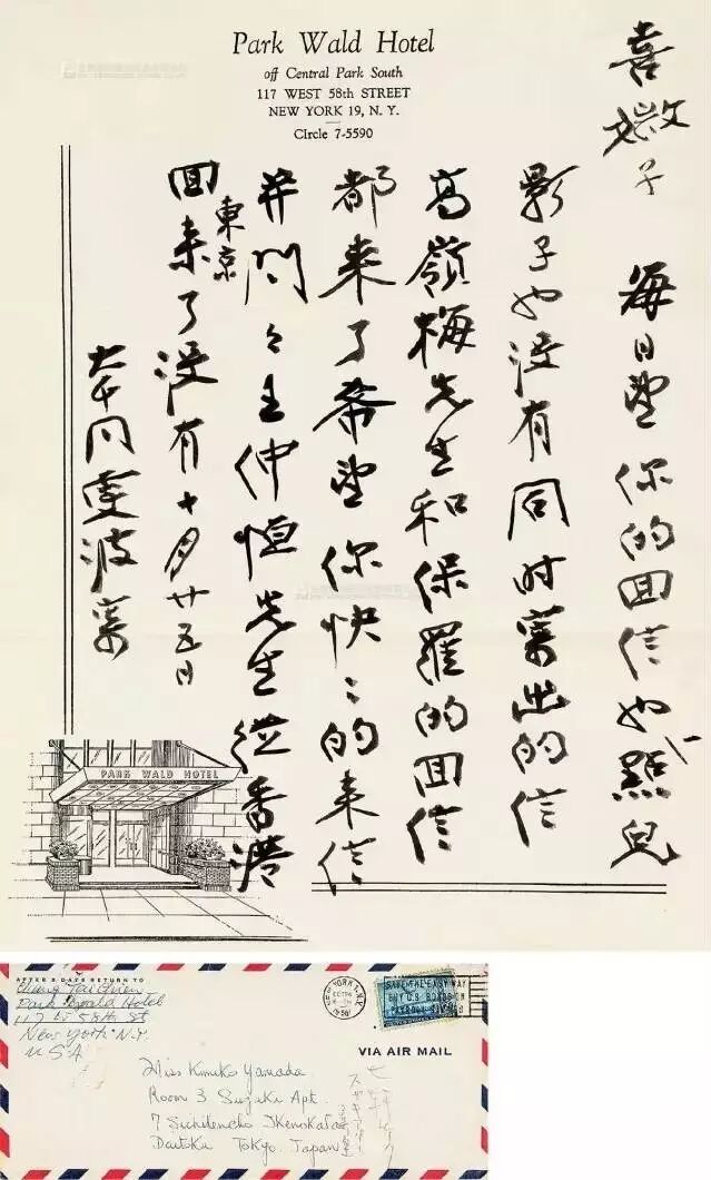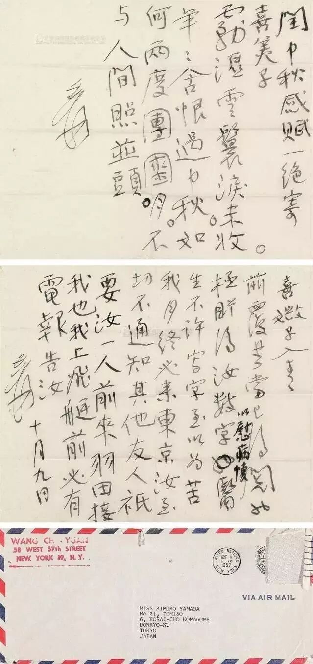 八月廿九日来信收到了,中国话大有进步非常欢喜。我今月廿一日飞纽育在纽育停留廿日,即飞东京。到了纽育再与你联络,只要一人前来羽田,我不欢喜别的人来接我,希望你寻着我这封信快速的回信,寄在纽育王济远君转给我。不忍池的莲花还有吧,可惜我们不能与你共赏,但是无论如何必定赶来同看京都高尾的红叶唷。雯波夫人与你买了一粒伯国产品有名的海水蓝宝石,你一定很欢喜的。九月十六日爰雯波同寄喜媺子。D.C.Chang c/o c.y.Wang 58 W.57st.n.y. new yorkU.S.A.