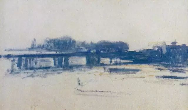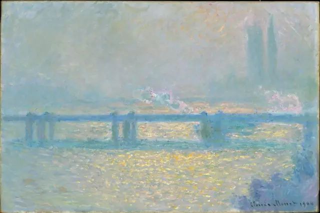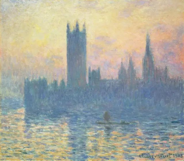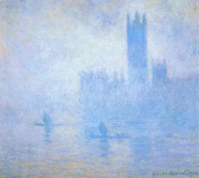 英国的雾都伦敦刺激了他的画瘾,他渐渐学会表现藏在烟雾中的景物。他在海德公园、泰晤士河上画了许多写生作品。散漫的光线极易发挥画家的小笔触功力。比较著名的“国会大厦”系列,有十几幅作品。