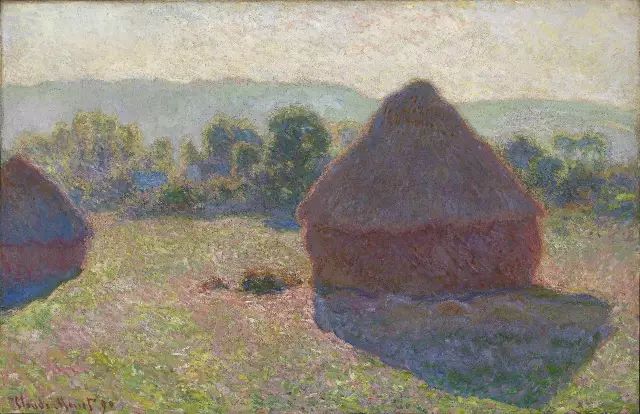 《干草堆》是莫奈的主题绘画系列之一,它记录了干草堆在一天不同时间光照下的色彩变化,印象派画家强调瞬间的视觉印象,其绘画表现的是一瞥的印象,一反以往那种追求精确逼真的绘画观念。倘若想在印象派绘画中寻找逼真的一面,那么就要远看。但印象派绘画吸引人的正是它的朦胧和色彩变化的微妙。