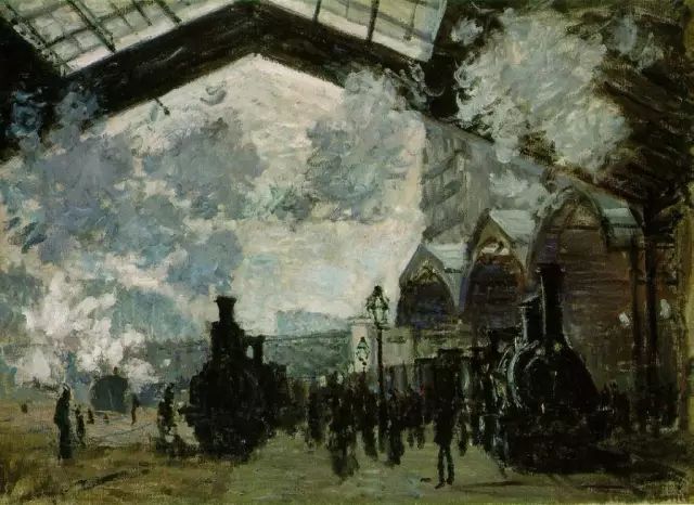 绘于1877年的“圣拉扎尔火车站”是一幅表现巴黎火车站的画,这是一个日常生活场面的实际“印象”。莫奈神往于光线穿过玻璃顶棚射向蒸气烟云的效果,神往于从混沌之中显现出来的机车和车厢的形状。莫奈相信光线和空气的神奇效果是最为重要的,他巧妙的平衡了画面的调子和色彩,这幅画出色的表现了力量、空间、对比和运动。