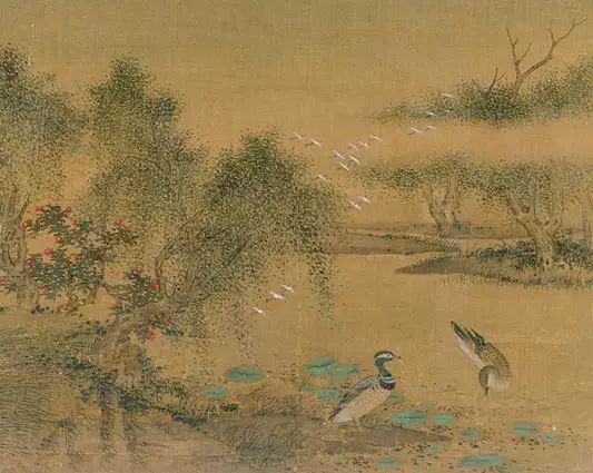 溪中莲叶点点,鸂鵣戏水,其乐融融。