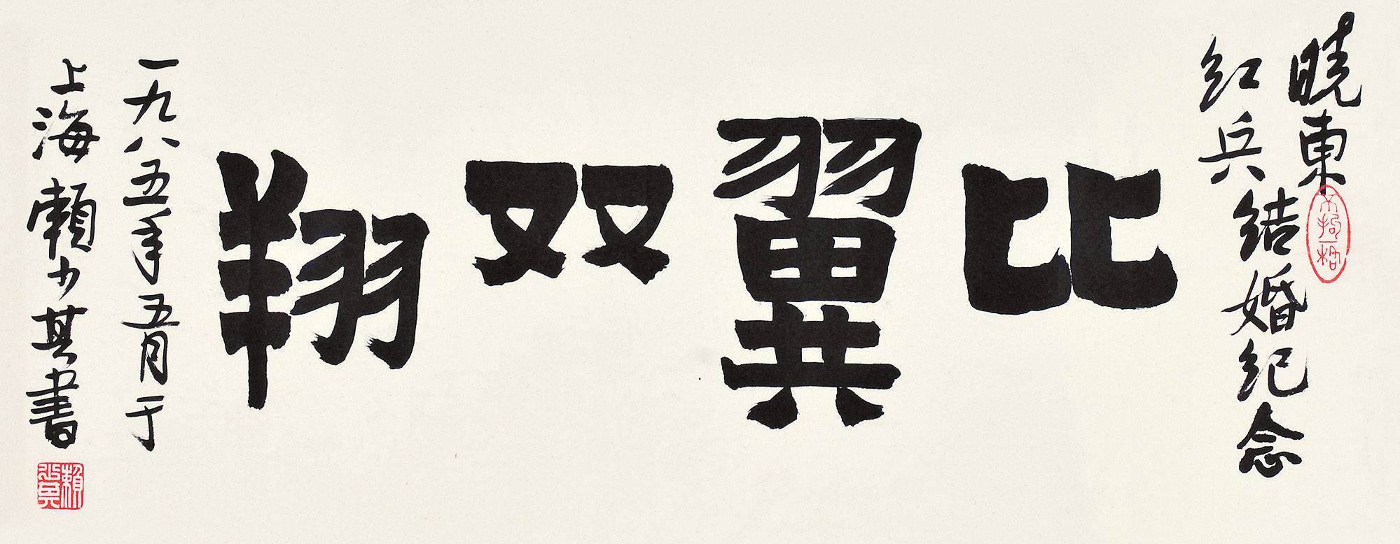 近人赖少其并师《爨宝子》和金农法,所作横批,正文成隶式,厚拙错落,