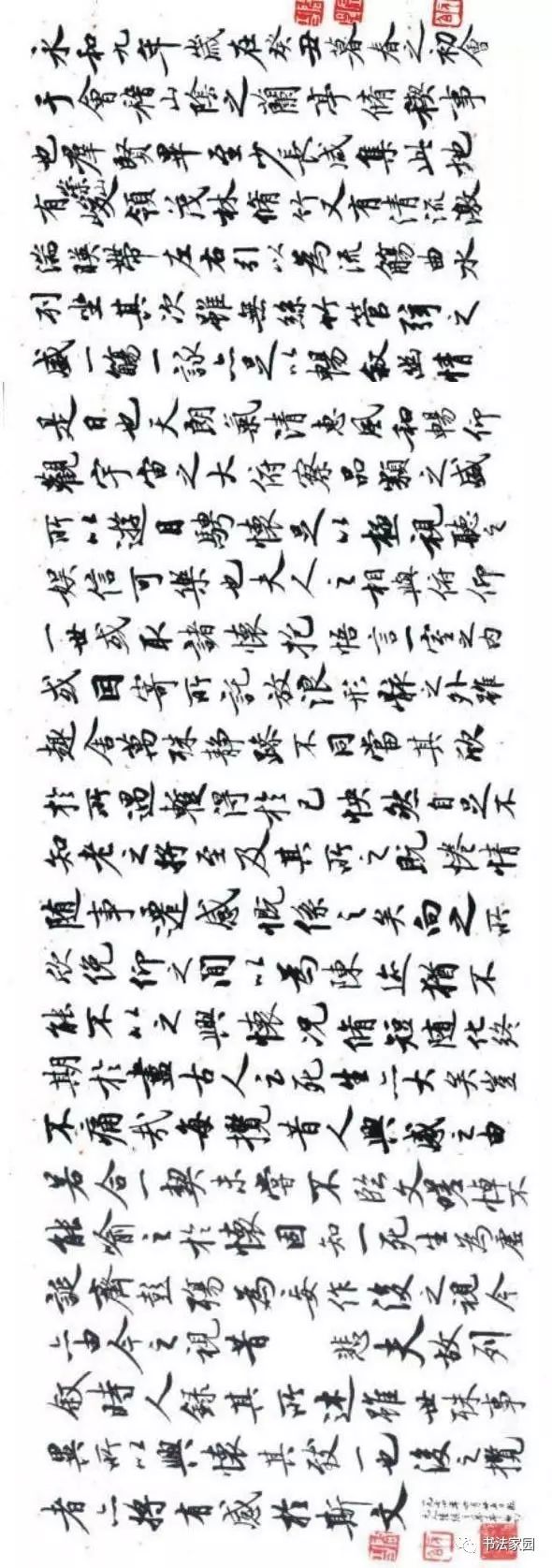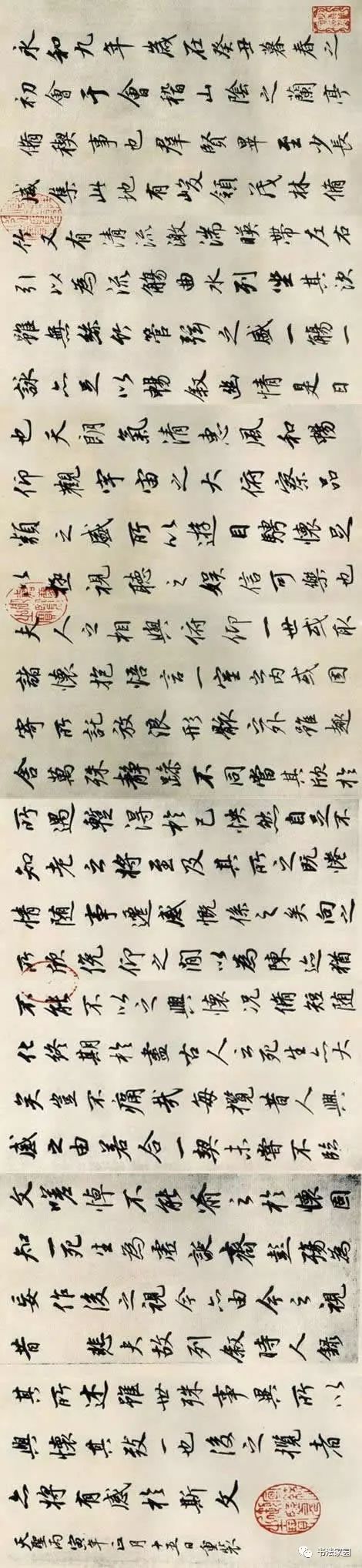 《兰亭序》,又名《兰亭宴集序》、《兰亭集序》、《临河序》、《禊序》、《禊贴》。为三大行书书法帖之一,系中华十大传世名帖之一。东晋穆帝永和九年(公元353年)三月三日,王羲之与谢安、孙绰等四十一人,在山阴(今浙江绍兴)兰亭“修禊”,会上各人做诗,王羲之为他们的诗写的序文手稿。序中记叙兰亭周围山水之美和聚会的欢乐之情,抒发作者好景不长,生死无常的感慨。法帖相传之本,共二十八行,三百二十四字,章法、结构、笔法都很完美,是他三十三岁时的得意之作。后人评道“右军字体,古法一变。其雄秀之气,出于天然,故古今以为师法”。因此,历代书家都推《兰亭》为“天下第一行书”。存世唐摹墨迹以“神龙本”为最著,唐太宗时冯承素号金印,故称为《兰亭神龙本》,此本摹写精细,笔法、墨气、行款、神韵,都得以体现,公认为是最好的摹本;石刻首推“定武本”。经郭沫若考证,以为相传的《兰亭序》后半文字,兴感无端,与王羲之思想无相同之处,书体亦和近年出土的东晋王氏墓志不类,疑为隋唐人所伪托。但也有不同意其说者。《兰亭序》表现了王羲之书法艺术的最高境界。作者的气度、凤神、襟怀、情愫,在这件作品中得到了充分表现。古人称王羲之的行草如“清风出袖,明月入怀”,堪称绝妙的比喻。