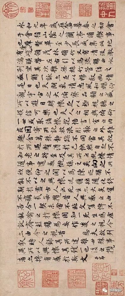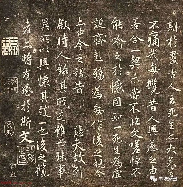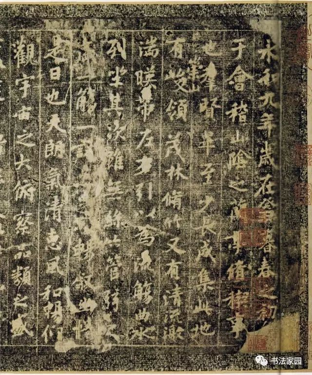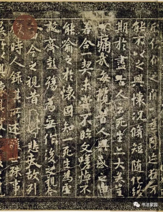 今天所谓的《兰亭序》,除了几种唐摹本外,石刻拓本也极为珍贵。最富有传奇色彩的要数《宋拓定武兰亭序》。不管是摹本,还是拓本,都对研究王羲之有相当的说服力,同时又是研究历代书法的极其珍贵的资料。在中国书法典籍中有关《兰亭序》的资料比比皆是,不胜枚举。