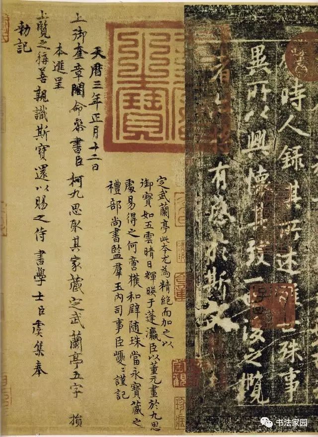 此后又有唐太宗派“萧翼计赚兰亭”的传说……唐太宗对王羲之书法推崇备至,敕令侍臣赵模、冯承素等人精心复制一些摹本。他喜欢将这些摹本或石刻摹拓本赐给一些皇族和宠臣,因此当时这种“下真迹一等”的摹本亦“洛阳纸贵”。此外,还有欧阳询、褚遂良、虞世南等名手的临本传世,而原迹,据说在唐太宗死时作为殉葬品永绝于世。
