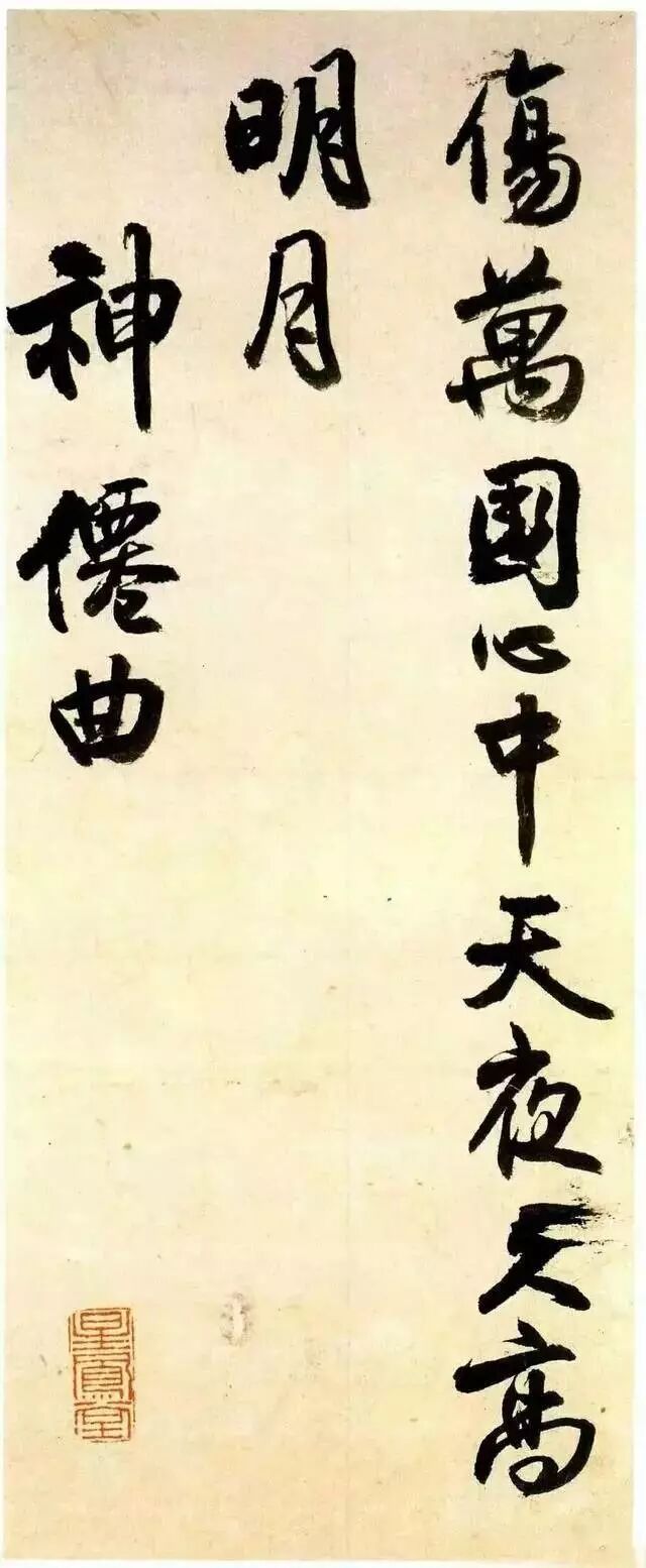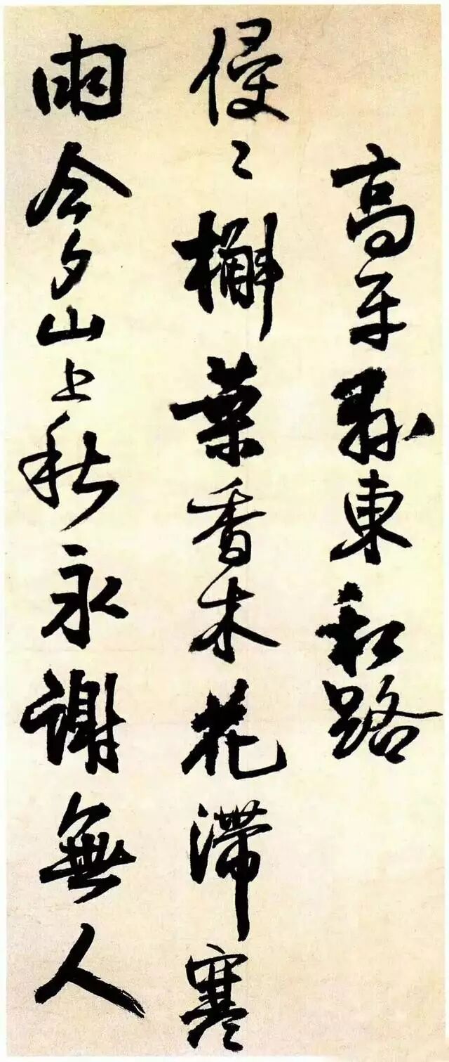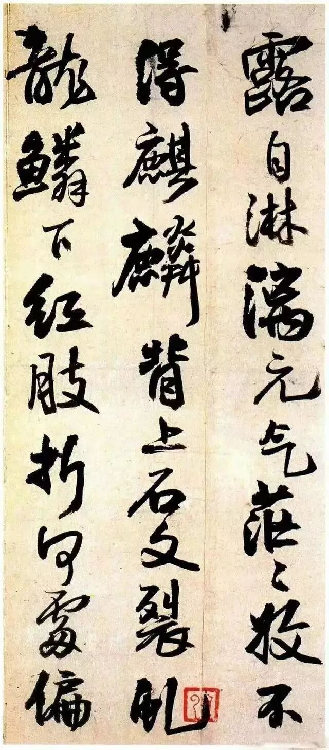 王铎确实有“独宗羲献”的作品,而这件不是,其欹侧之势出自李北海,迅疾出自米芾,而浑厚明显是法颜真卿。在这件作品中,王铎使用大量的湿墨,造成笔痕涨出,形成块面,与清爽迅疾的笔法形成对比。书法充满激情,连绵不断,气势贯通。