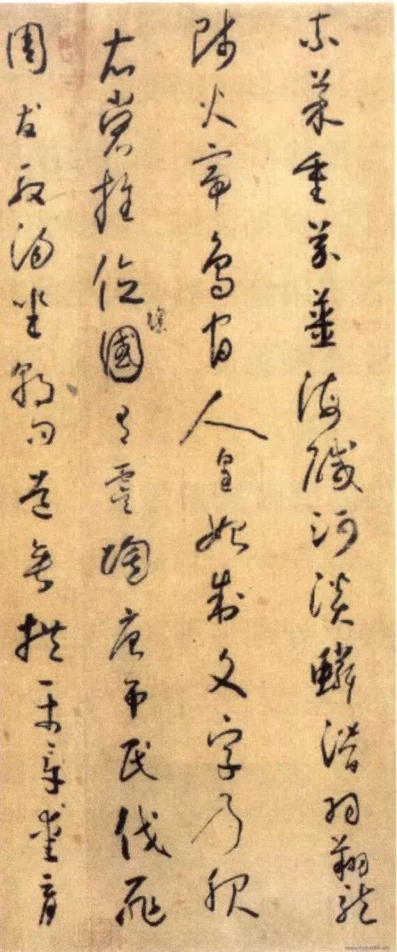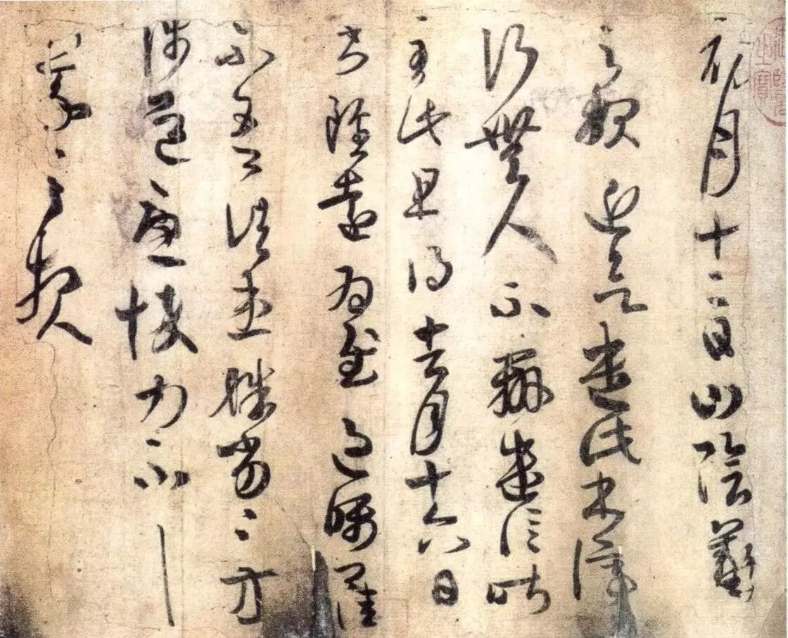 唐代张怀瓘在《书断》中说:“字之体势,一笔而成,偶有不连,而血脉不断。”用于小草是最适当的,虽有时笔画不牵连写而仍气脉相贯,流动自然。一字如此,一行也如此。字与字之间的流动贯气,主要靠字与字之间的欹侧斜正的变化,通过长短、宽窄、大小、轻重、松紧的对比形成上下连贯的节奏与韵律。如图王羲之《得示帖》,上下字间递相映带,字字牵连承上引下,灵动流畅,在静止的纸上表现出动态美。这种连贯的气势还需从用笔的精熟中来。若用笔滞凝,神情呆板,拘谨不畅,则必无流畅可言,贯气就更谈不上了,草书之作全在神驰情纵,得心应手之间写出精神和气质来。