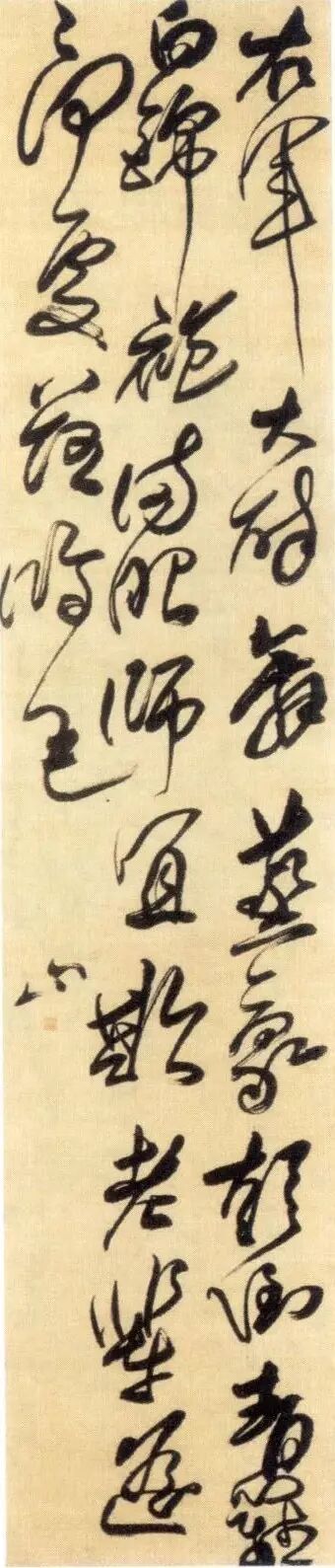 段落在行气中代表着作者情绪的起伏,是行气的具体表现。每一个书家都有着不同的书写方式和方法,从而表现出来的情绪节奏感也都不一样,有对比强烈和对比不强烈之分。例如徐渭《草书杜甫怀西郭茅舍诗轴》(图5),张瑞图《草书偶然作》(图6),张旭《古诗四帖》(图7),王铎《杜甫秋兴》(图8),这四个组合进行对比,则会发现,张瑞图的节奏段落气息紧密,“有狂夫茫然无”六字紧密连接,线条的虚实变化不明显,段落节奏变化不强。徐渭“阶面青苔先自生”七字组合与王铎“彩笔昔曾”四字组合,则是线条从重到轻,字形大小参差,墨色浓淡变化共同运用,使得节奏段落组合变化莫测,对比强烈。再看张旭“龙泥印玉简”五字组合,气息连贯,“泥”与“印”、“印”与“玉”字相互牵连欹让,似乎有意排布经营,疏密错落,曲折奔腾。节奏段落组合的出现使得草书在形式上,特别是行气上出现了众多的变化。由于组合的字数不同,方式不同,这些组合出现千变万化的形式,为书家表现情感提供了很多的方便。