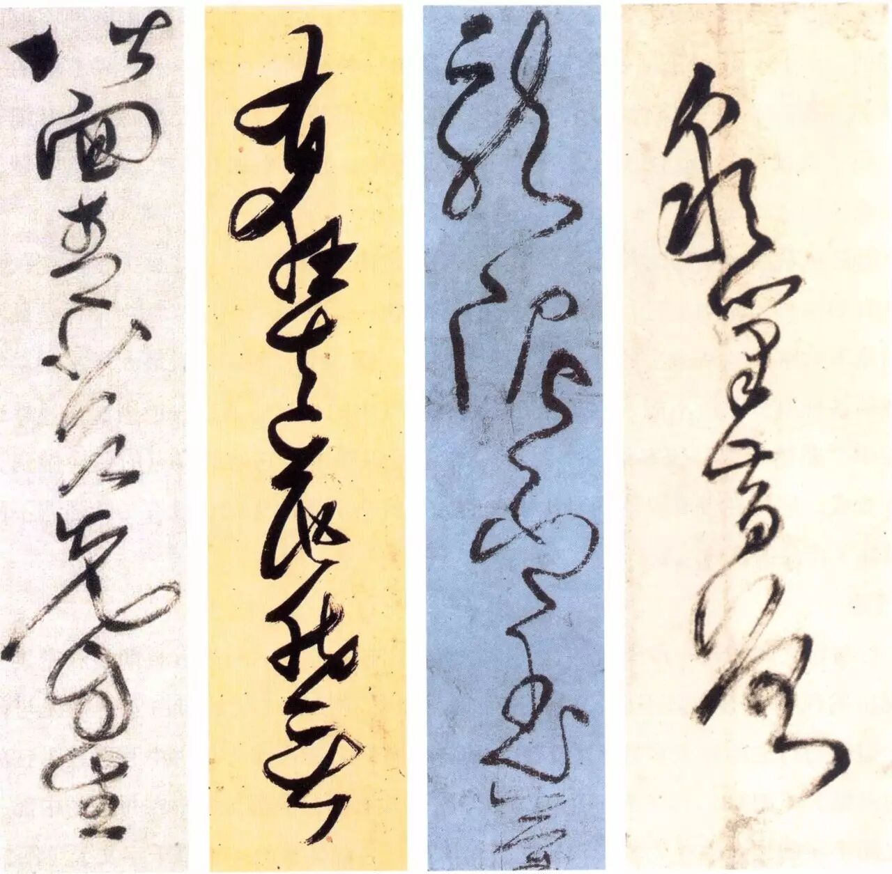 从左至右依次为:孙过庭《书谱》“非专精也”;怀素《自叙帖》“中妙怀”;黄庭坚《诸上座贴》“复别有”;祝允明《前后赤壁赋》“清风徐来”