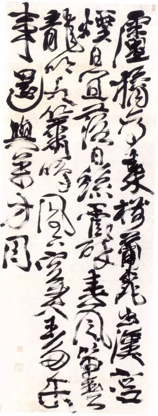草书的线条变化无穷,结体的形状、争白的趋势、单字的轻重大小可以因情而变。因此无论是字中布白,还是逐字、行间的布白,其形态都是变化无穷的。下面举几例作品进行整体章法的分析。