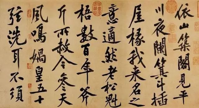米芾书法的特点是七歪八斜的造型,弯弯曲曲的线条,或粗或细反差强烈的点画。