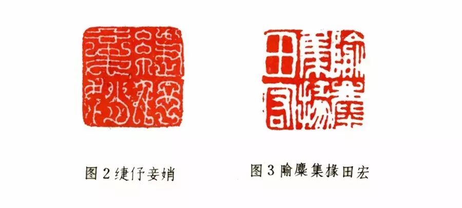 私印或连官职铸刻。按其性质仍是私印。传世有汉代“【左“纟”,右“捷”字右部分】伃妾【左“女”,右“肖”】”玉印,便是一例③(图2)。魏武帝《选举令》:“魏诸官印各以官为名印”④,但这类印章传世不多。顾氏《集古印谱》卷一收录“裨将军张赛”一印,《十钟山房印举》举之二收录“尚书散郎田邑”、“逾麋集掾田宏”(图3)两印,大约就是三国以后印。