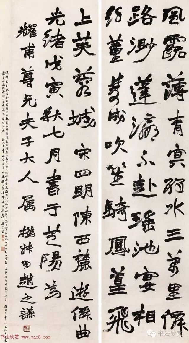 中秋月正明,夜半飞紫琼。拂袖天上去,揽衣朝太清。缥缈黄金阙,迢遥白玉京。离离百宝幢,袅袅九华旌。箫韶起碧落,散花飘群英。翱翔鸾鹤舞,清澈云璈声。凌凌九霄寒,风露薄青冥。弱水三万里,仙路眇蓬瀛。不赴瑶池宴,相约董双成。吹笙骑凤凰,飞上芙蓉城。宋四明陈西麓游仙曲。光绪戊寅秋七月书于芝阳,为耀甫尊兄夫子大人属,撝叔弟赵之谦。