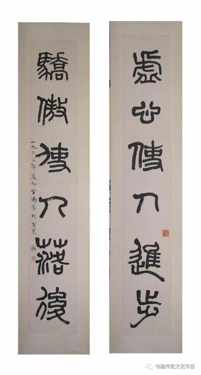 童老是安徽巢县人,家境一般,是个农民,他在家里是最小的,家里四个姐姐,他从小身体不怎么好,看他种田不行,让他读读书吧,他很聪明,也喜欢写刻,等到他16岁中学毕业的时候,他的姐夫看他的兴趣,就建议他到上海去考美术专科学校,他考取了。听师母讲她那个时候家里很简陋,他把字帖贴到墙上。洗脸的时候,一边洗脸还一边看,不放过一切学习的机会,他的书法现在看来很有特色,很险峻,力度很大,有魏碑的形式,又有隶书篆书的形式,等于说他把很多碑帖的东西都融入到里面,所以形成童老师独特的字!