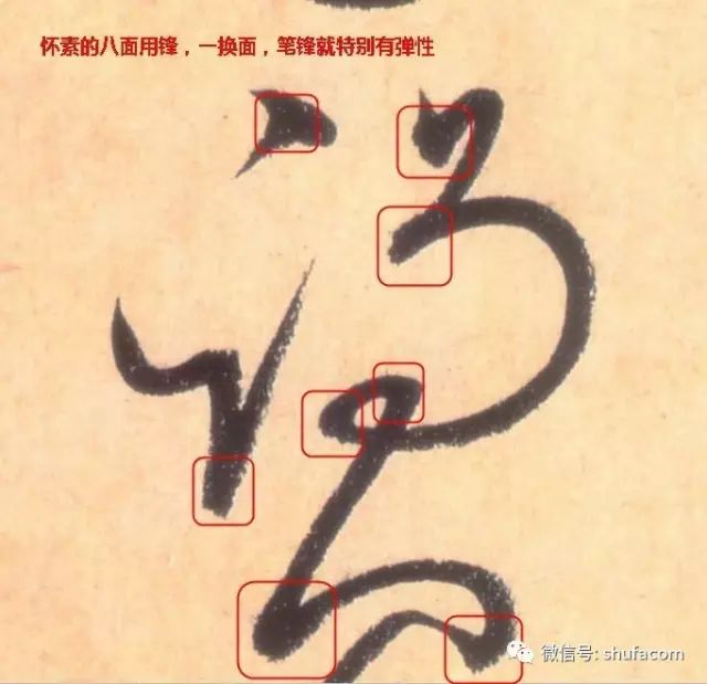 另外,有人为八面出锋,就不是遵循中锋运笔的原则了,这是对八面出锋的误解和对中锋的片面理解。很明显,八面出锋有利于在笔画换向时保持中锋。