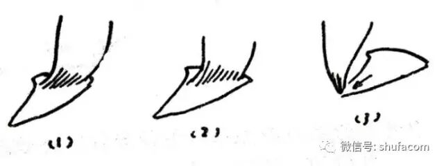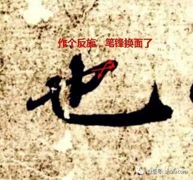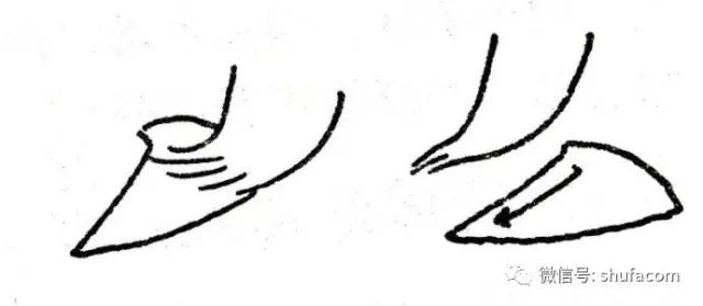 须将笔锋作1200左右的大幅度调向,其如图,写到心钩的出钩处,为保证出钩时的中锋效果,不懂得八面出锋原理者,艰难繁复可想而知,而且笔锋易曲扭,缺乏弹性,影响笔画力度,懂得八面出锋的,只须稍回顶立起笔锋,换以左上面反劲出锋,即可得饱满劲利的钩状,熟练时,几时看不出行笔有停顿。
