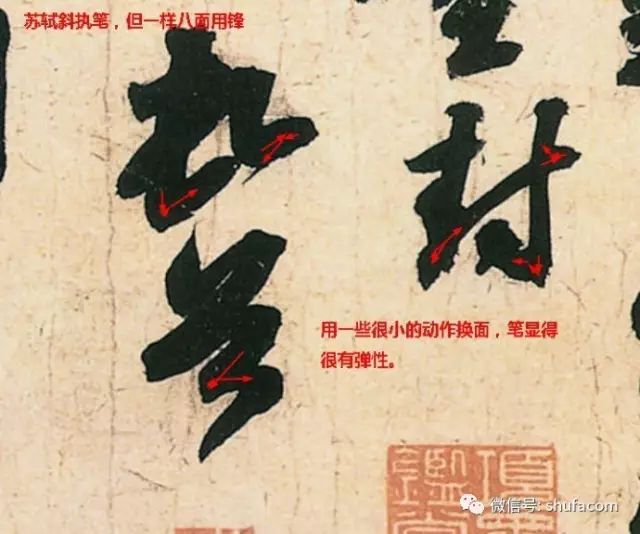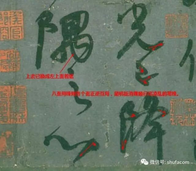 笔画路线转换了,就随势换用相应的锋画,八面都自如的得以运用,八面生势,也就保证了在任何方向角度保持中锋。