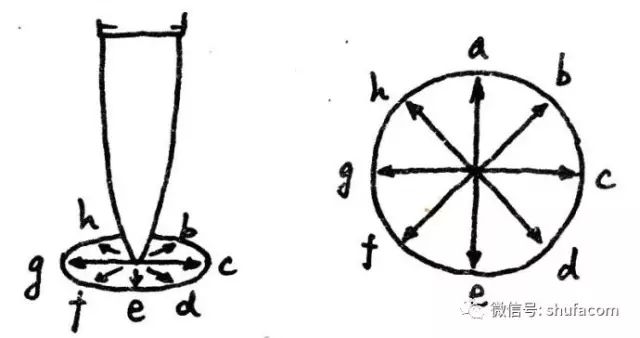 八面用锋的原则,指笔向不同的方向走动,应施以相应的笔画着纸运行。