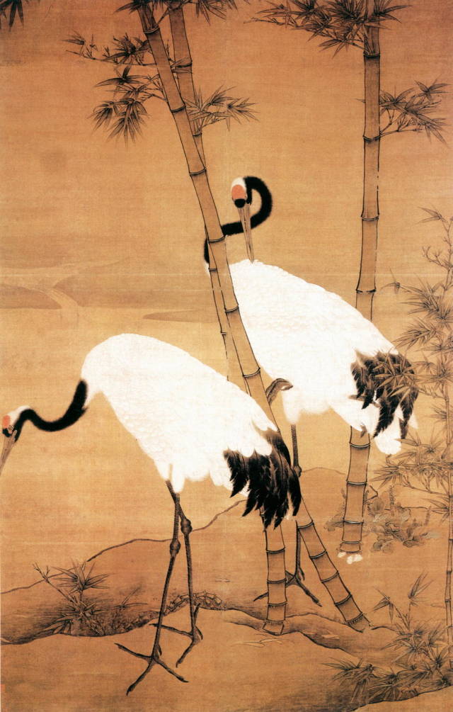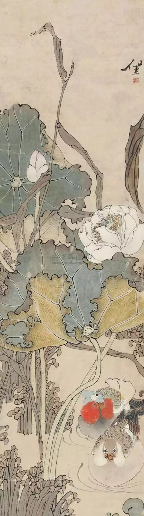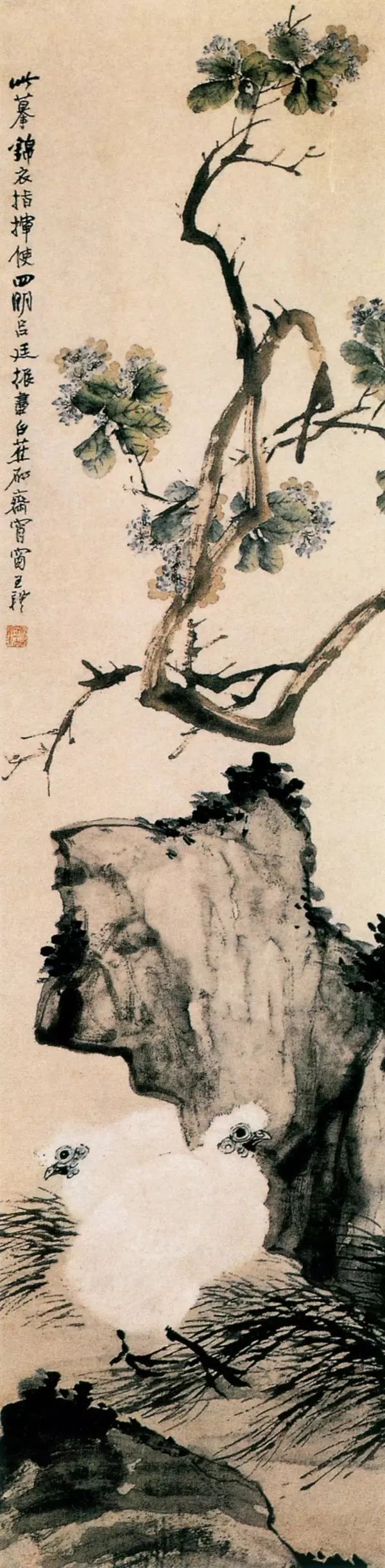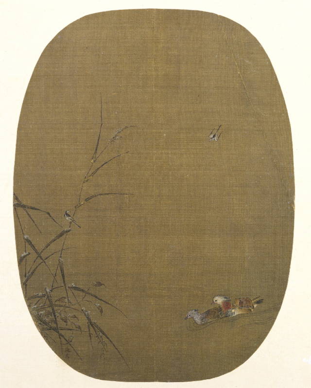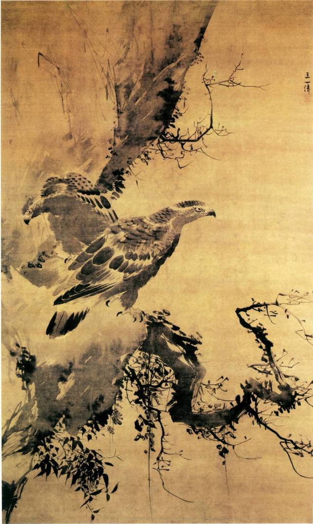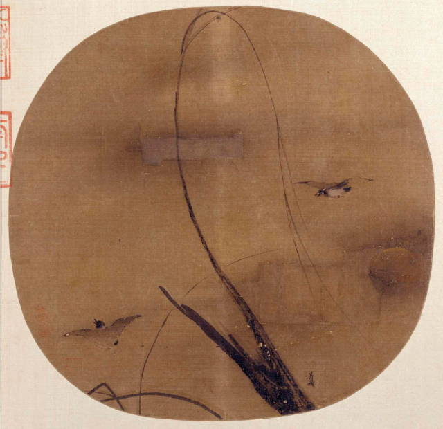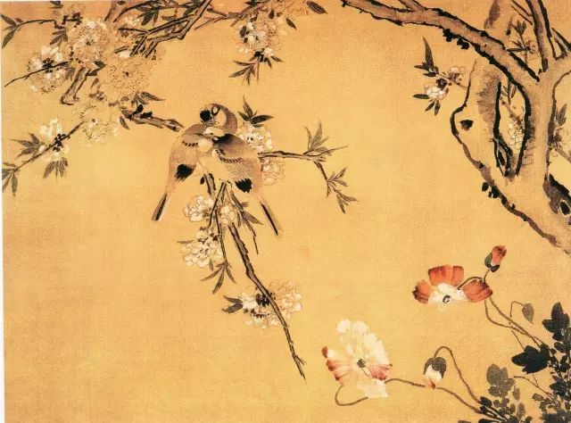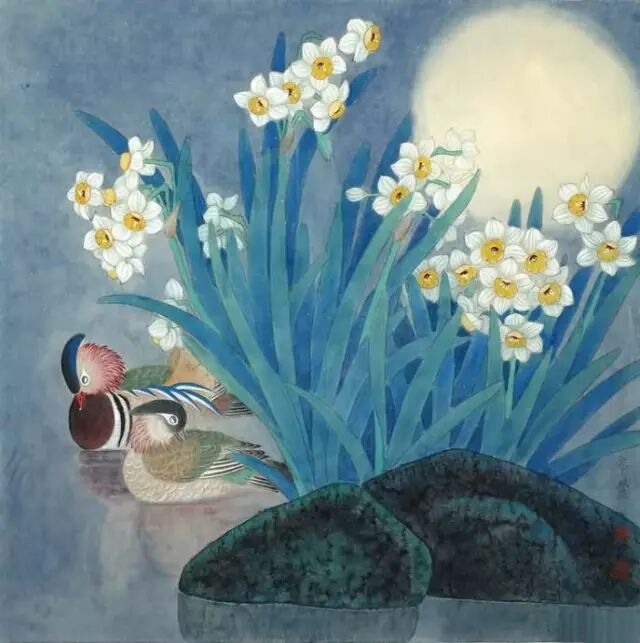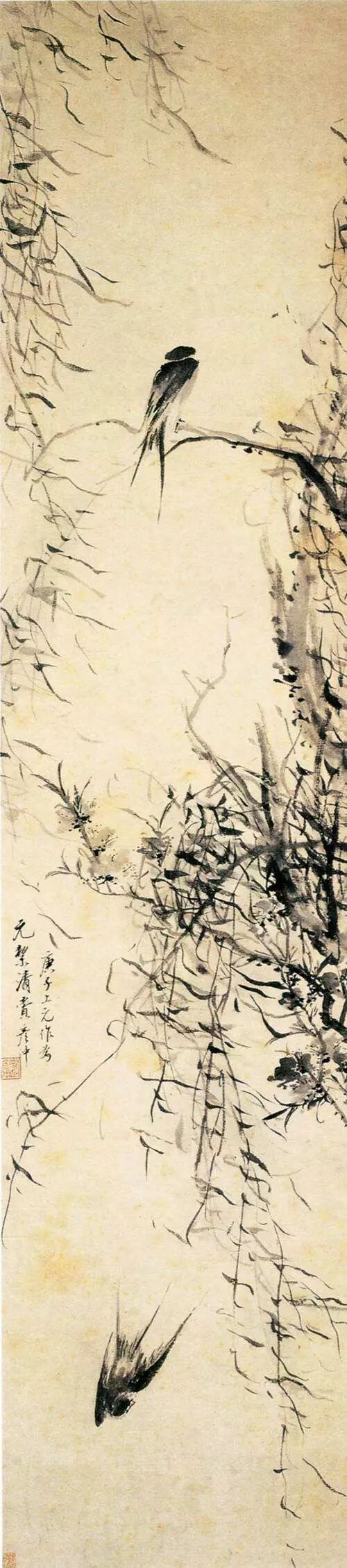 大片空白处淡墨晕染出的薄云满月,给空谷春山平添了几分神秘。初升的月亮惊起的两只山鸟奋飞呼鸣,打破了夜空的静寂,老柳虽然细弱,枝条却仍坚韧,使观者感受到自然生命的搏动。