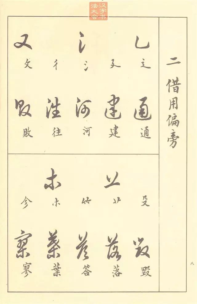 编写原则以草书的正规写法为经,变化写法为纬。内容分为八个部分:首列偏旁写法,分专用借用两类;前者介绍各种偏旁的正规草法,后者介绍并借偏旁的写法(并借傍旁,由于过去创造的太多,这里只选几种比较通常的作为示范,兼备选择)。其次在草书里,“点”和“折”占着重要地位,一个字少了一“点”,多了一“点”,或少了一“折”,多了一“折”,就会变成另一个字,很容易混淆误会,的以在三、四、五部分分别介绍一些字形近似的字。又因有许多是一个字有几种不同写法,和同一写法面又代表两个不同的字的情况,在六、七部分里,也作若干介绍,以引起注意,免得误写误认。还有不少草书字是用逆笔或特殊笔顺书写的,因而把这类的一些字,列入最后部分里。由于本人对草书的修养不够,兼之限于篇幅,不可能把草书所有的写法及其变化,作全面的分析介绍,不过学者如能对这里所介绍的写法记熟写熟,那么对一般的草书字体,大致可以不会认错写错了。